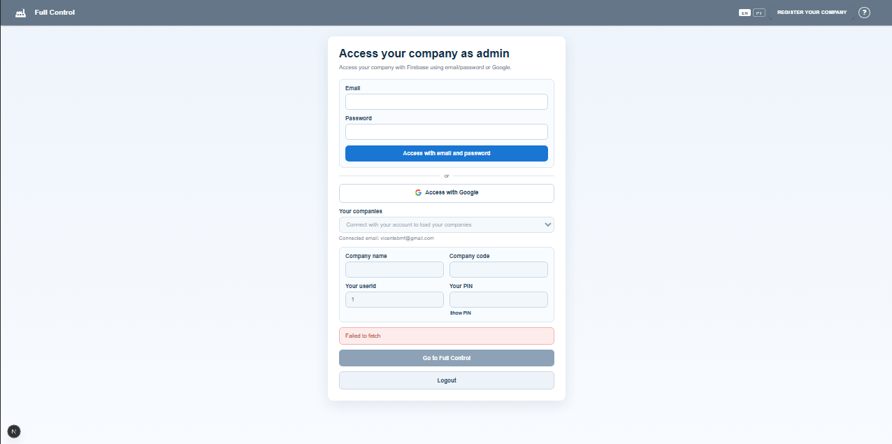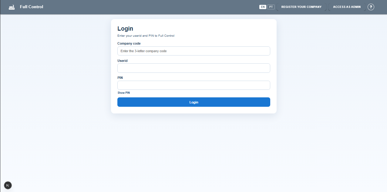 The login screen is the initial Full Control screen. You must fill in the information below, provided by the Full Control admin in your company, to access the system.