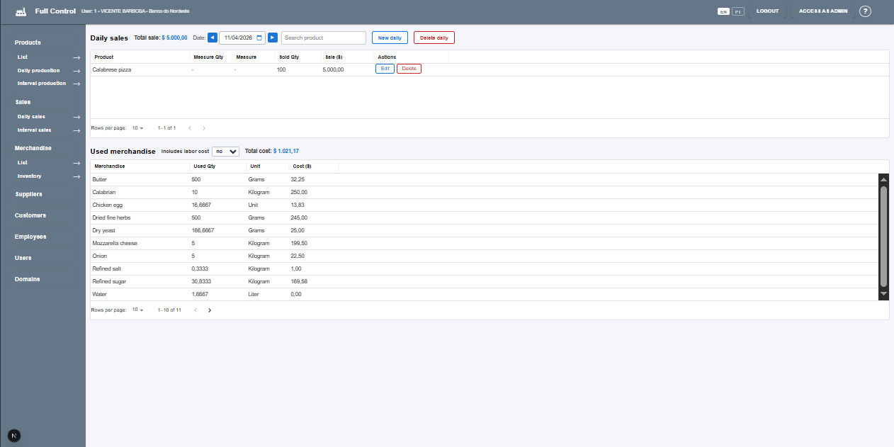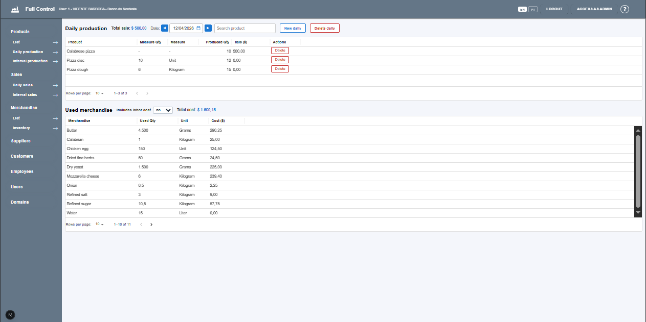 On this screen, you only need to inform which products were produced on the day and in what quantities, and the system will calculate the quantities of merchandise used and their costs.