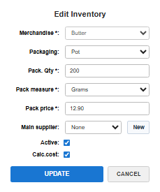 The lower part contains inventory items or presentations of selected merchandise. There must be at least one inventory item for each merchandise, otherwise it will not be considered for calculation, even if it composes products. Information: