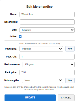- Unit of measure: suitable unit for merchandise type. For merchandise, prefer larger units such as kilograms, liters, and meters, but this is not a rule.