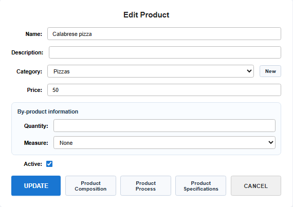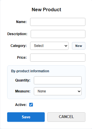 The upper part of the screen is common to finished products and by-products. Organize them into categories and enter 0 as the price for by-products.