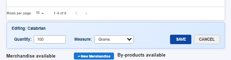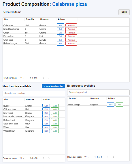 The lower part of the screen contains information specific to a by-product, namely the produced quantity and the unit of measure. For example, making pizza dough uses several ingredients (merchandise) in quantities defined by the production process. The dough produced will yield a final quantity that can be measured in units of weight, volume, length, or quantity.