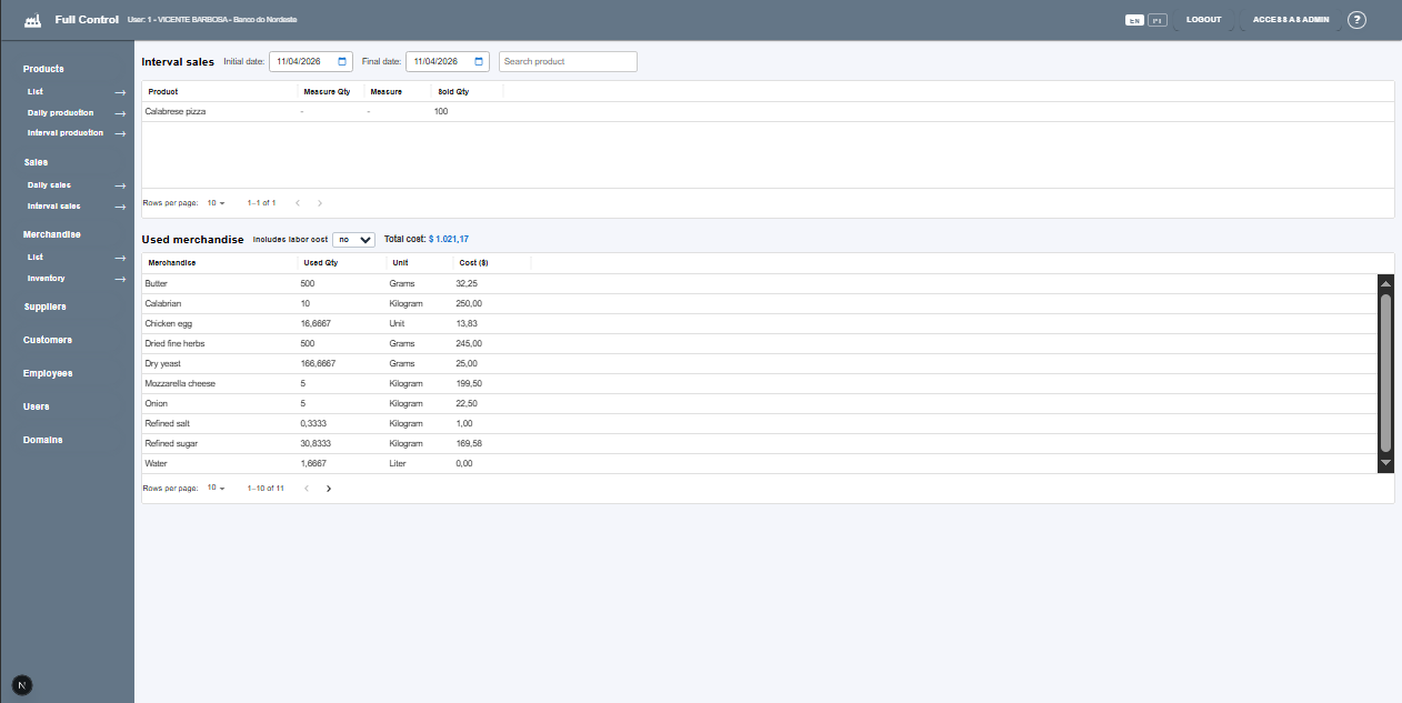 This screen is a variation of the daily production screen, with the possibility of indicating a date range. This feature is useful to determine whether the quantity of merchandise calculated by the system based on production is compatible with the merchandise inventory count. Of course, the quantities should not be identical, but they should be close.