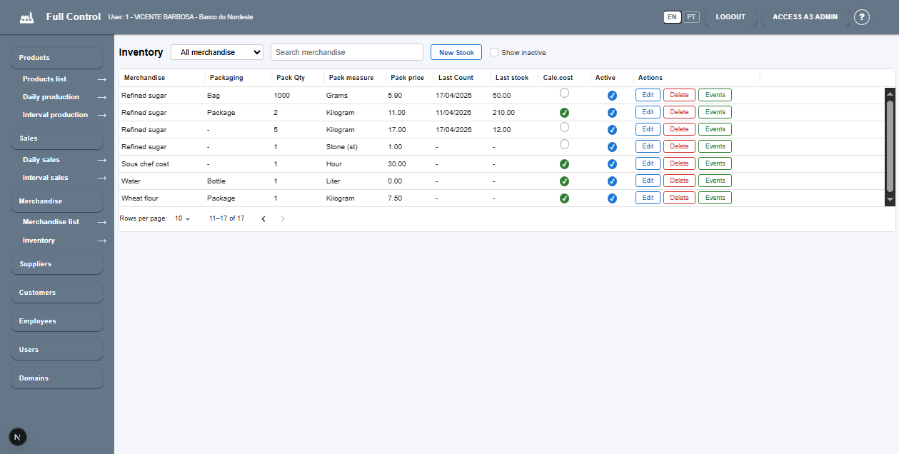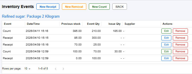 - Counted stock: manually counted quantity at a given date. This count is entered in Inventory Events through the Events button.