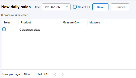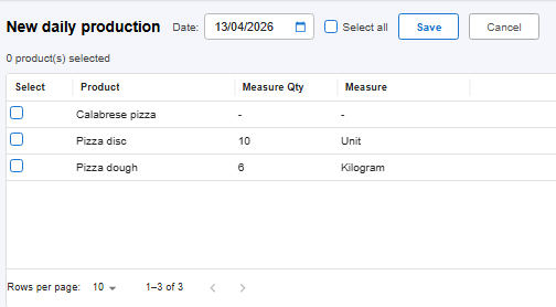 On the "Select products" screen, select the finished products and by-products produced on the day. If you prefer, you can use the "Select all" option. Click "Save" to return to the daily production screen.