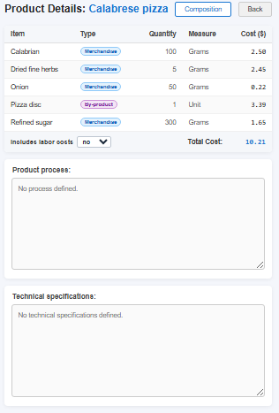 Click Details on the created product. You will see a screen similar to the one below, with the selected items and the proportional cost of the merchandise and by-products used in the product composition, as well as the total cost. You can choose whether to display labor time costs or not.