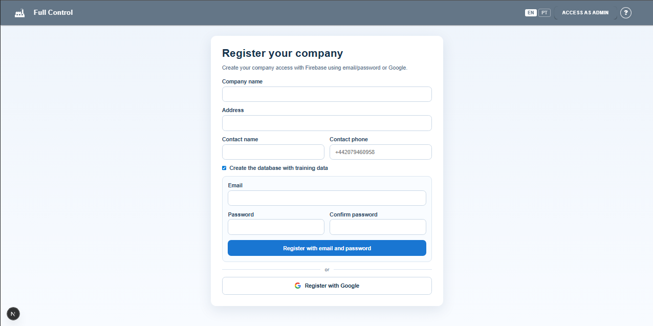 After a successful registration, you will be redirected to the "Access your company as admin" screen, already showing the data returned during registration, namely: