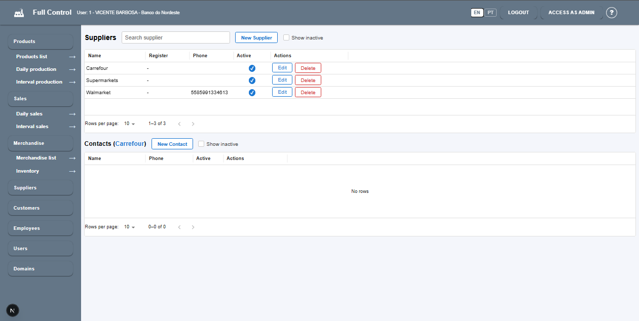 The upper part has the list of registered suppliers, which can be associated with inventory items of merchandise.