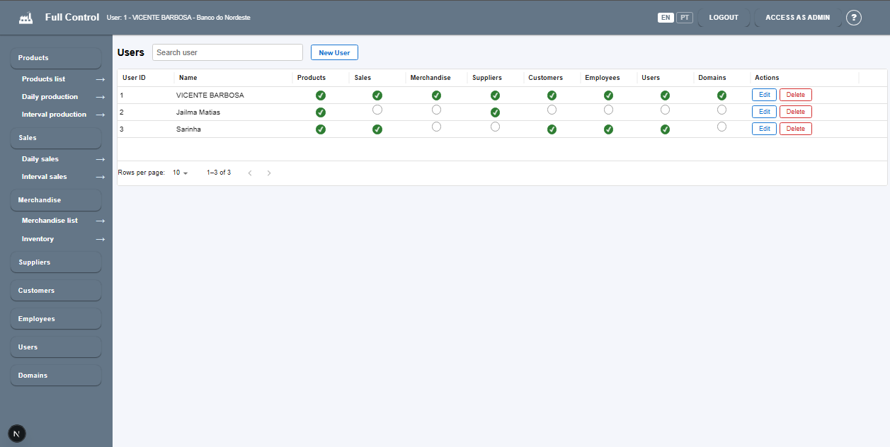 User 1 (admin) is created automatically when the company is registered and has permission in all system modules. You can also create other users with permission in the desired modules.